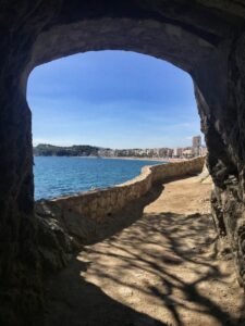 Von hier aus geht es über Treppen bergauf und durch weitere Ferienhaus-Siedlungen, bis wir über eine steile Serpentinentreppe wieder hinab zum Meer steigen. Dort wandern wir auf einem schönen, mit Steinmauern umfassen Pfad in Richtung Lloret de Mar, von wo aus uns immer zahlreicher Kurzausflügler entgegenkommen. Nach einem sehr pittoresken Küstenabschnitt mit glasklarem Wasser lässt sich spätestens nach einem kurzen Tunnel die dichte Bebauung von Lloret de Mar nicht mehr ignorieren.